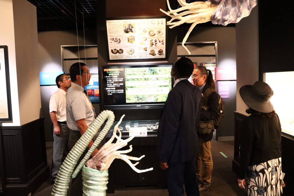 懇談のあと、愛媛大学ミュージアムを見学され、ミュージアムの西村勝志館長と吉田広教授から、本学がミュージアムを開館した経緯や展示品について説明を受けました。マルワラ学長は熱心に耳を傾け、展示品やパネルの説明に見入っていました。