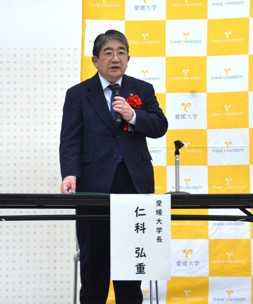 除幕式は、今治地域地場産業振興センターの玄関前にて行われ、仁科弘重学長、徳永繫樹今治市長をはじめ、地元産業界からは、株式会社新来島どっくの森克司代表取締役社長、BEMAC株式会社の小田雅人代表取締役社長など関係者8人が除幕を行いました。続いて、記念写真撮影が行われた後、1階展示ホールにて仁科学長、徳永市長による挨拶があり、約60人の参加者の前で今治サテライト設置の意義や今後の展望について語られました。