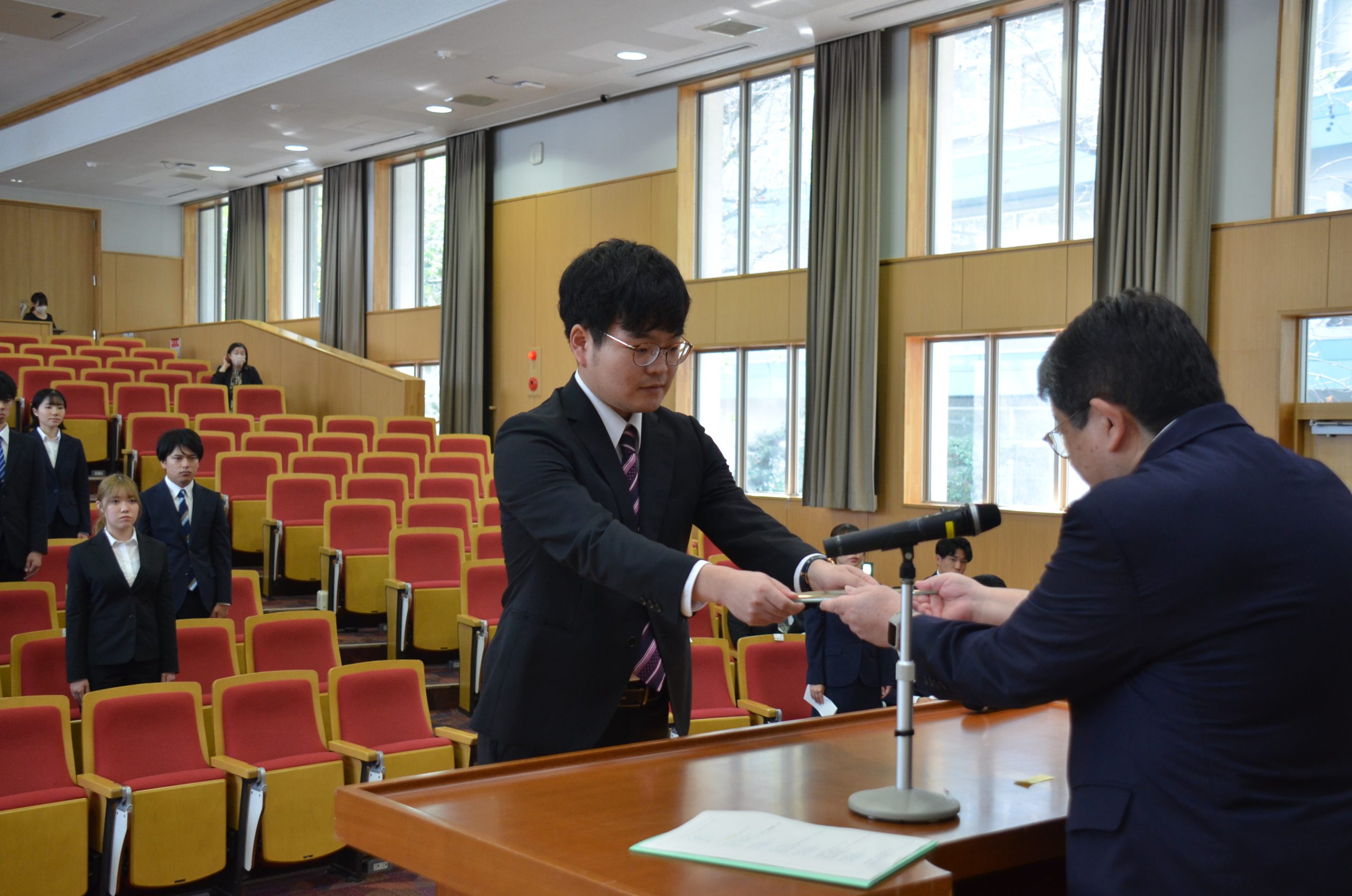 表彰式では、仁科弘重学長から、受賞者代表である医学部6年生の佐々木健介さんに表彰状が授与され、「この受賞によって『皆さんが優秀で、日々の努力を続けられる人』であることが示されたわけですから、誇りをもって、他の学生の模範となるように努力して欲しいと思います」と激励の挨拶がありました。