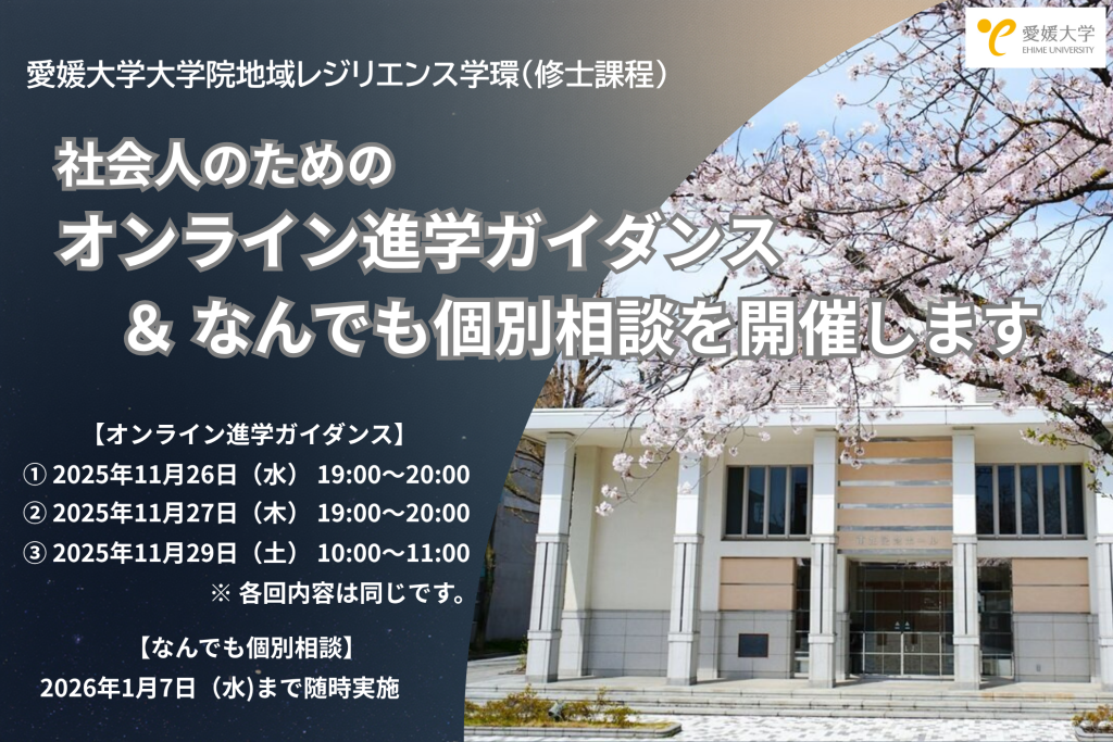 愛媛大学大学院地域レジリエンス学環では、標記のガイダンスを以下のとおり開催いたします。