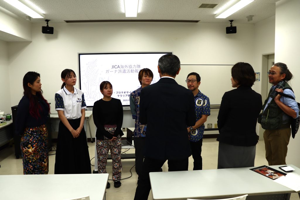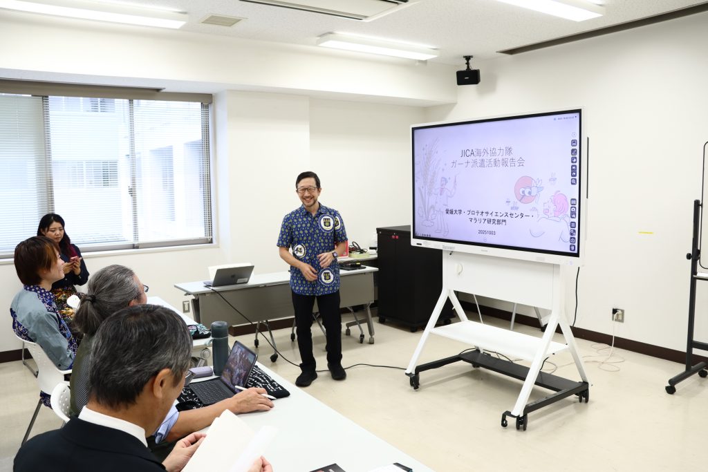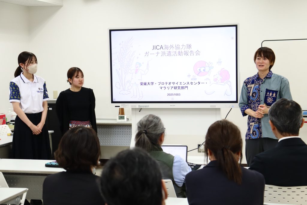 令和7年10月3日(金)、愛媛大学は独立行政法人国際協力機構(JICA)と締結した覚書に基づき、ガーナ共和国のガーナ大学附属野口記念医学研究所へ派遣した学生・教職員による活動報告会を開催しました。