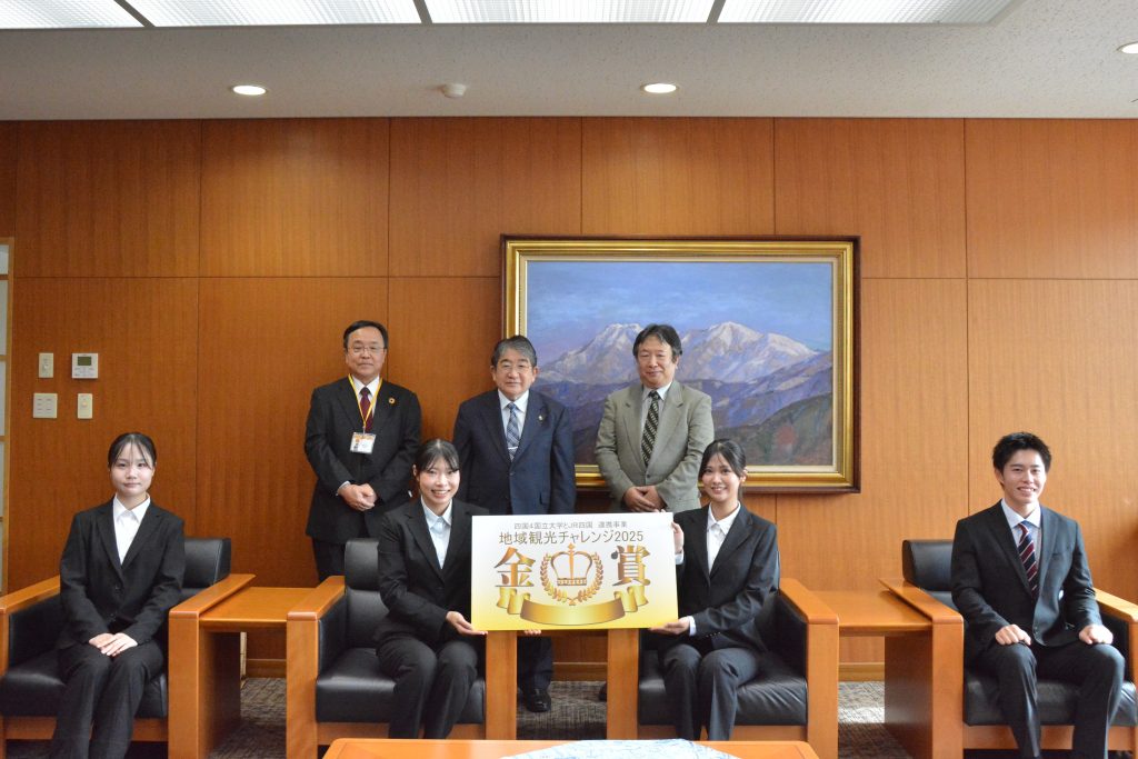 令和7年9月22日(月)、JR四国と四国4国立大学(愛媛大学、徳島大学、香川大学、高知大学)が連携事業として行っている「地域観光チャレンジ2025」成果発表及び最終審査会が高知大学で開催され、本学からエントリーした社会共創学部の「チーム丹原」が金賞を受賞しました。これを受けて、令和7年11月5日(水)に、チーム丹原のメンバーが仁科弘重学長に結果を報告しました。