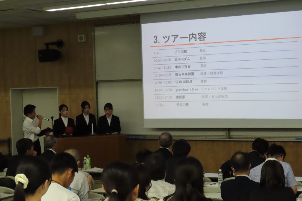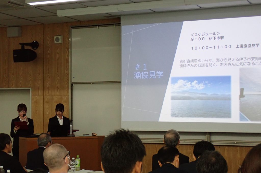 本学からは「水資源に恵まれない土地で栽培される幻のキウイ」をテーマに西条市丹原地区の水資源とキウイについて学ぶ体験型旅行プランを企画した「チーム丹原」、「しらすと伊予市」をテーマに伊予市沿岸部の漁業について観光資源として着目し、ツアーを提案した「しらすチーム」の2チームが発表しました。