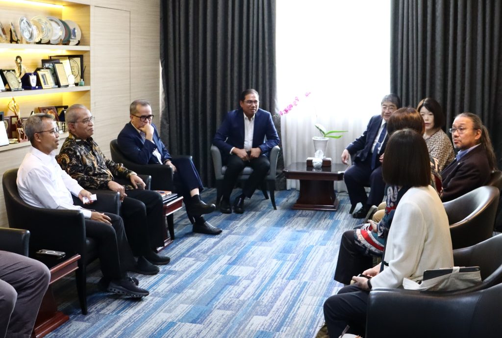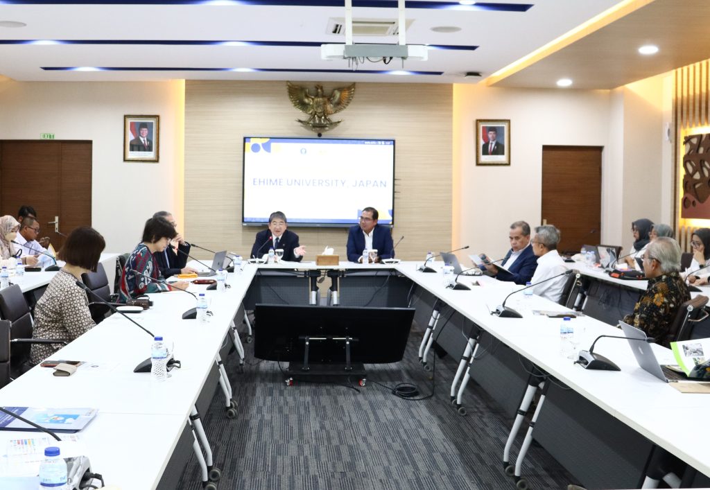表敬訪問に続いて、一行は両大学間の今後の交流について協議する会合に出席しました。仁科学長は、「貴学との間で、教育・研究の両面において深い交流を重ねてまいりました。特に、SUIJI(Six-University Initiative Japan Indonesia)コンソーシアムを通じて、両国の学生が農山漁村でのサービスラーニングを共に行い、持続可能な社会の構築に向けた実践的な学びを深めております。愛媛大学は、四国最大の総合国立大学として、今後もボゴール農業大学との連携をさらに強化し、教育・研究・地域貢献の各分野において、より実りある協力関係を築いていきたいと考えております。」と挨拶しました。アリム副学長は、連合農学研究科(博士課程)を平成29年に修了した本学の卒業生であり、多くの愛媛大学卒業生・修了生がボゴール農業大学で教員として活躍していることに触れたうえで、愛媛大学との関係を強化していきたいと述べました。
