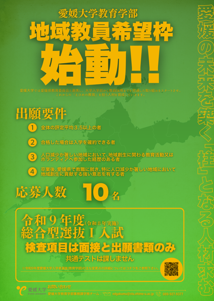 愛媛大学教育学部では、令和8年度から『地域教員希望枠(募集人員10名)』を新設し、本学卒業後、愛媛県内の人口減少が著しい地域の教員として地域創生に貢献しようとする強い意志を有する学生を募集します。