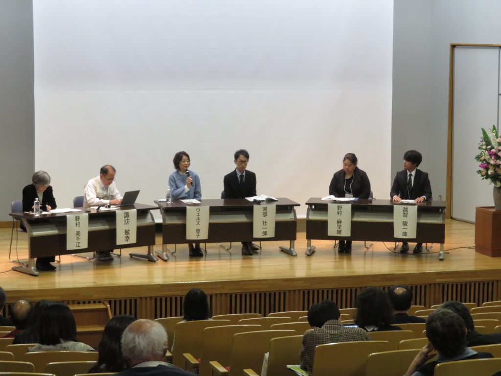 本学で行われた第2分科会では、立命館大学文学部のウェルズ恵子特任教授及び福井県立大学恐竜学部の河部壮一郎教授による基調講演と、大阪大学の諏訪敏幸氏による事例報告がありました。その後、聖カタリナ大学の野村美千江副学長をファシリテーターに迎えたパネルディスカッションを行い、当初の予定時間を超えて、活発な意見交換がなされました。