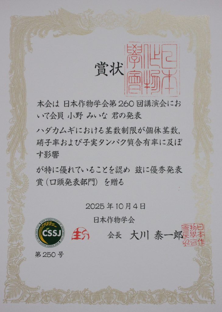 令和7年9月21日(日)、22日(月)に新潟大学で開催された「日本作物学会第260回講演会」にて、大学院農学研究科食料生産学専攻知能的食料生産科学特別コース作物学研究室2年生の小野みいなさんが優秀発表賞を受賞しました。