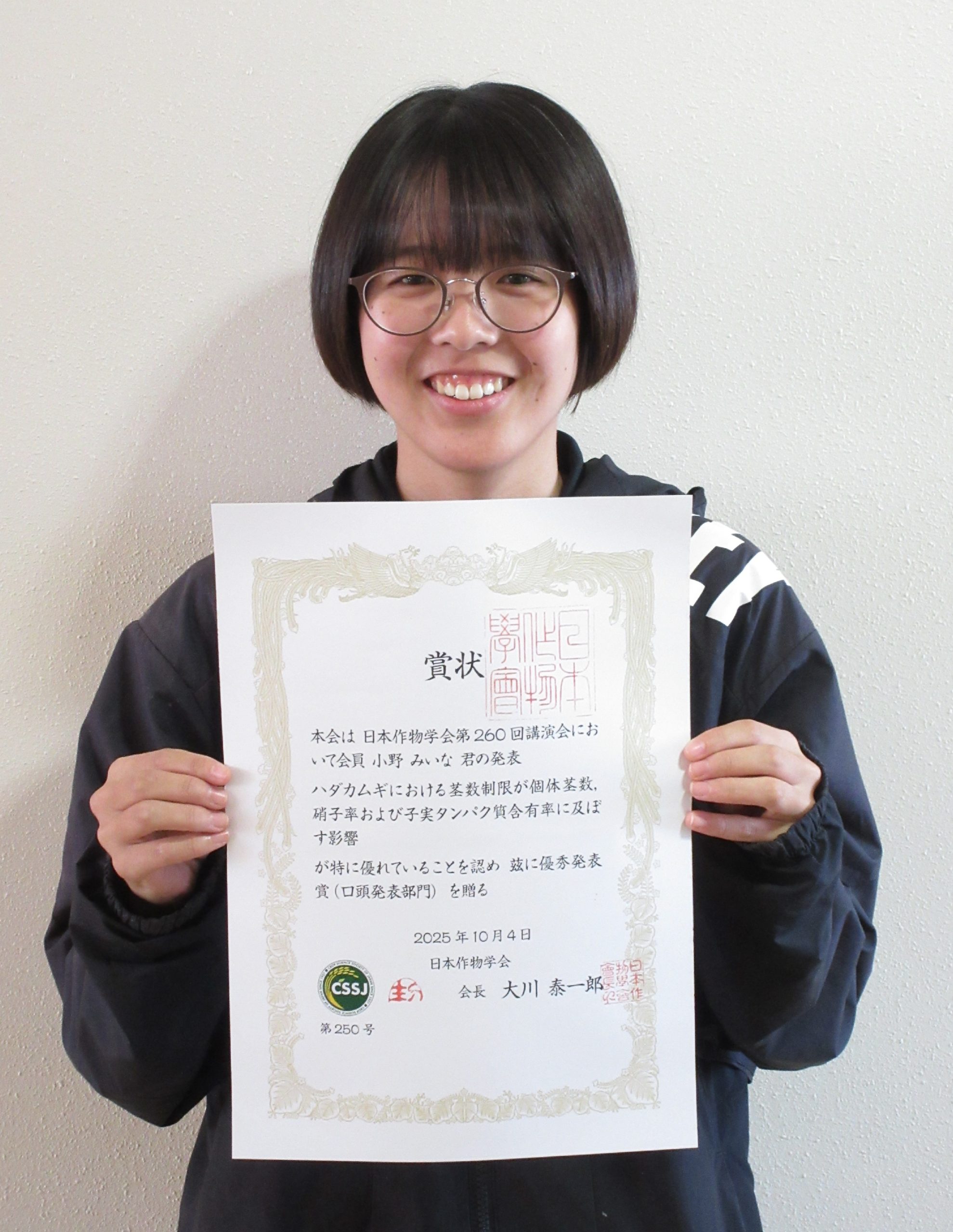 令和7年9月21日(日)、22日(月)に新潟大学で開催された「日本作物学会第260回講演会」にて、大学院農学研究科食料生産学専攻知能的食料生産科学特別コース作物学研究室2年生の小野みいなさんが優秀発表賞を受賞しました。