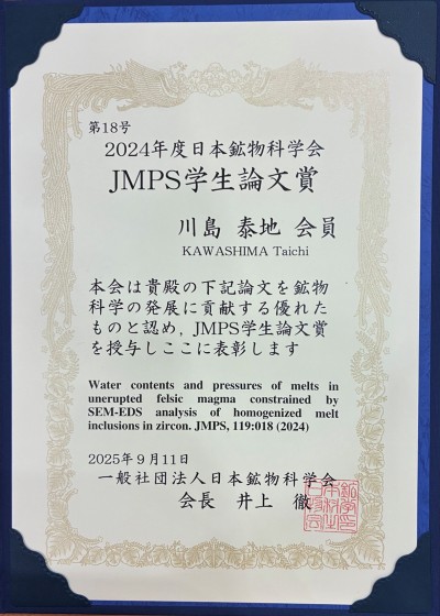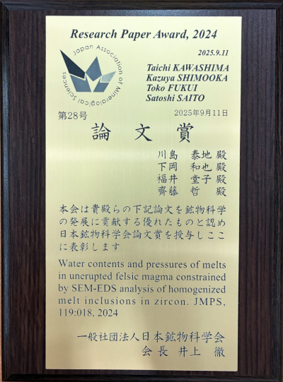 受賞対象論文は「Water contents and pressures of melts in unerupted felsic magma constrained by SEM-EDS analysis of homogenized melt inclusions in zircon(和訳:ジルコン中メルト包有物の均質化実験とSEM-EDS分析から制約した非噴出珪長質マグマ中のメルト含水量と圧力)」で、日本鉱物科学会発行の英文誌である「Journal of Mineralogical and Petrological Sciences (JMPS)」誌に2024年に公表されました。著者4名の論文投稿時の所属は、いずれも本学大学院理工学研究科です。