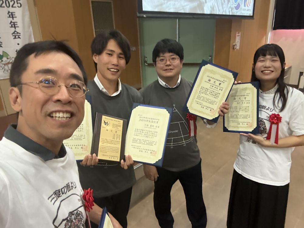 令和7年9月10日(水)~12日(金)に山口大学で開催された「日本鉱物科学会2025年 年会・総会」において、本学大学院理工学研究科修了生の川島泰地さん(現所属:株式会社 日さく)、同じく修了生の下岡和也さん(現所属:関西学院大学生命環境学部)、博士後期課程2年の福井堂子さん、齊藤哲准教授が、「日本鉱物科学会論文賞」を受賞しました。この賞は日本鉱物科学会発行の学術誌に発表された、優れた研究論文の著者に対し贈られる賞です。