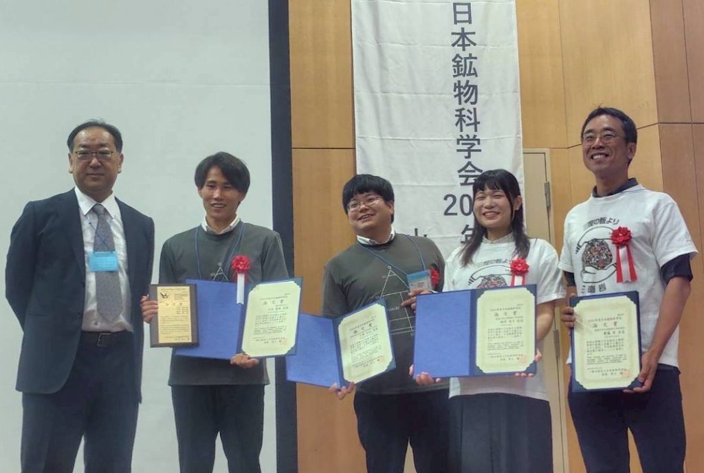 令和7年9月10日(水)~12日(金)に山口大学で開催された「日本鉱物科学会2025年 年会・総会」において、本学大学院理工学研究科修了生の川島泰地さん(現所属:株式会社 日さく)、同じく修了生の下岡和也さん(現所属:関西学院大学生命環境学部)、博士後期課程2年の福井堂子さん、齊藤哲准教授が、「日本鉱物科学会論文賞」を受賞しました。この賞は日本鉱物科学会発行の学術誌に発表された、優れた研究論文の著者に対し贈られる賞です。