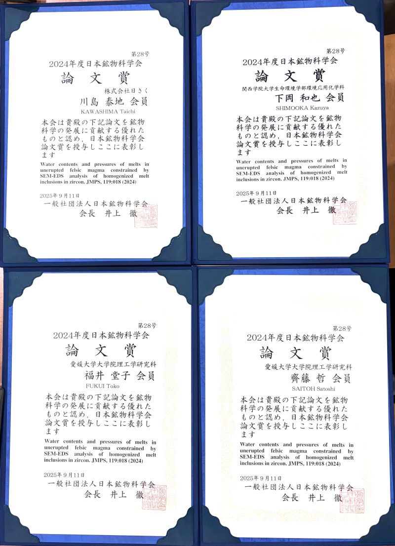 受賞対象論文は「Water contents and pressures of melts in unerupted felsic magma constrained by SEM-EDS analysis of homogenized melt inclusions in zircon(和訳:ジルコン中メルト包有物の均質化実験とSEM-EDS分析から制約した非噴出珪長質マグマ中のメルト含水量と圧力)」で、日本鉱物科学会発行の英文誌である「Journal of Mineralogical and Petrological Sciences (JMPS)」誌に2024年に公表されました。著者4名の論文投稿時の所属は、いずれも本学大学院理工学研究科です。