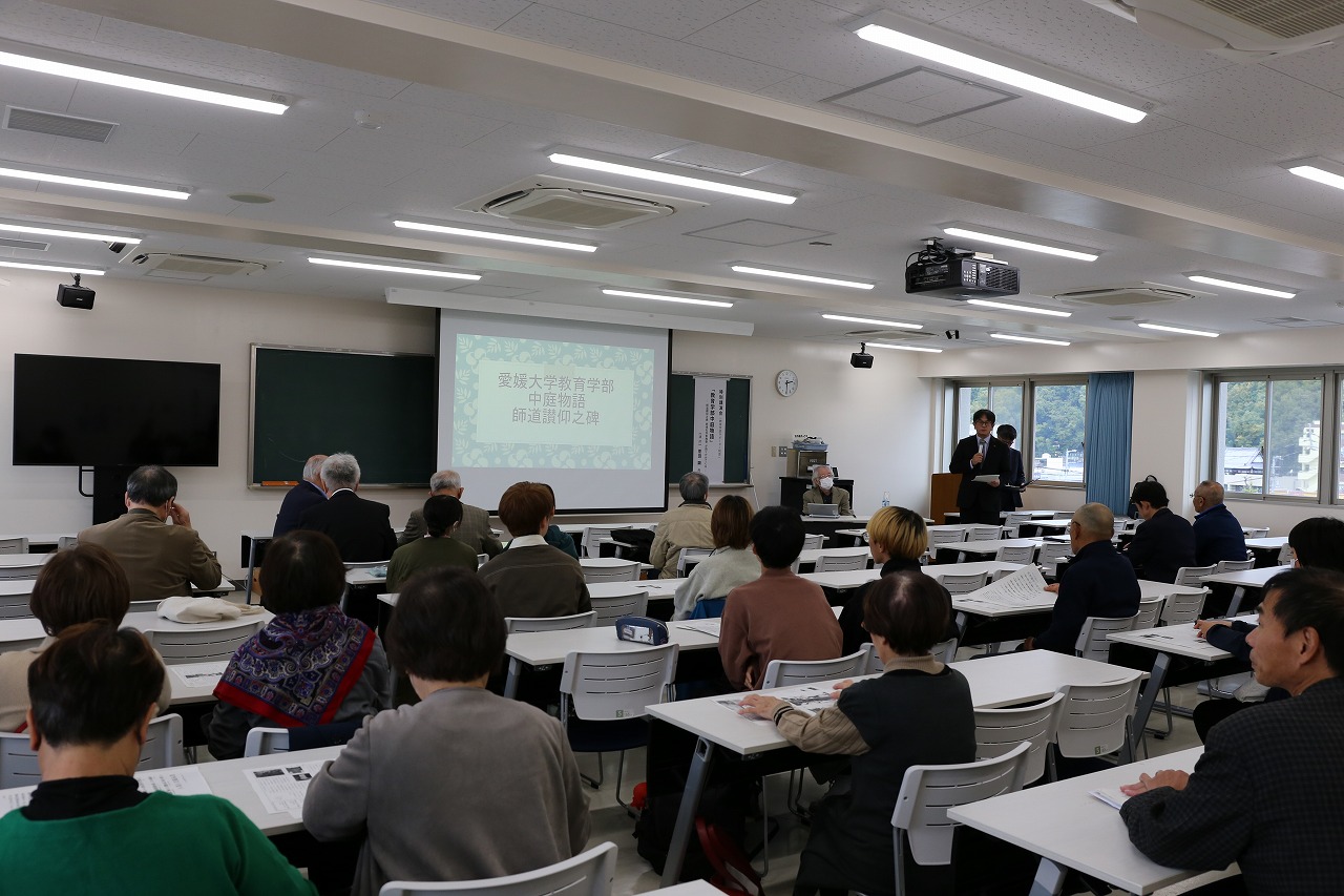 今回の演目は「教育学部中庭物語」で、菅田さんは約50人の受講生に対し、教育学部の中庭にある 「師魂石井素胸像」、「師道鑽仰之碑」を中心に、愛媛の師範教育の歴史、戦災による校舎の焼失、戦後の再建という、大きな時間の流れを体験談と資料から語られました。