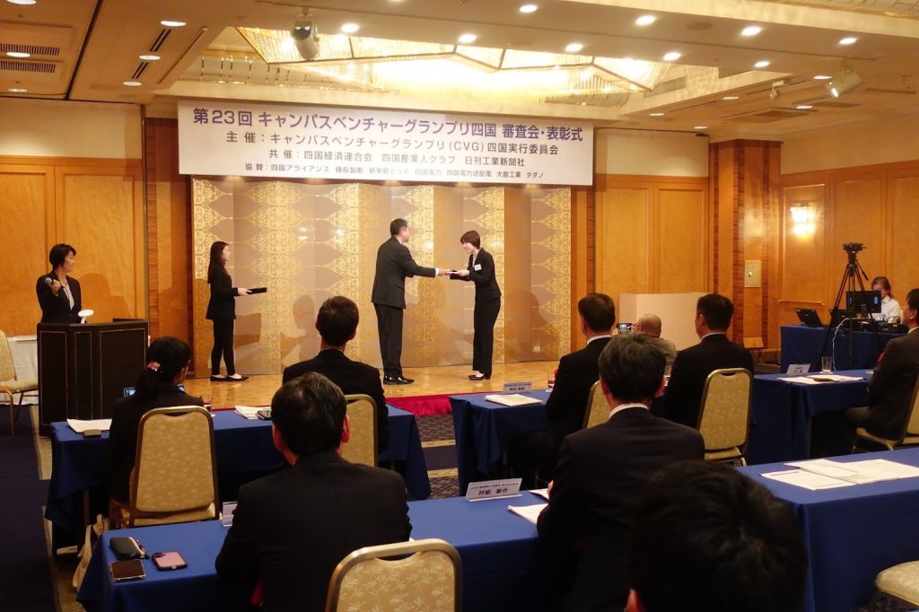 本コンテストに農学部3年生の中田歩実さんが登壇し、「Athlete Oasis ~選手の心を潤し、安心して挑戦できる環境を~」と題し、すべてのスポーツ選手の心身の健康をサポートするサービスについて発表を行いました。審査の結果、見事「特別賞(四国産業人クラブ賞)」を受賞しました。