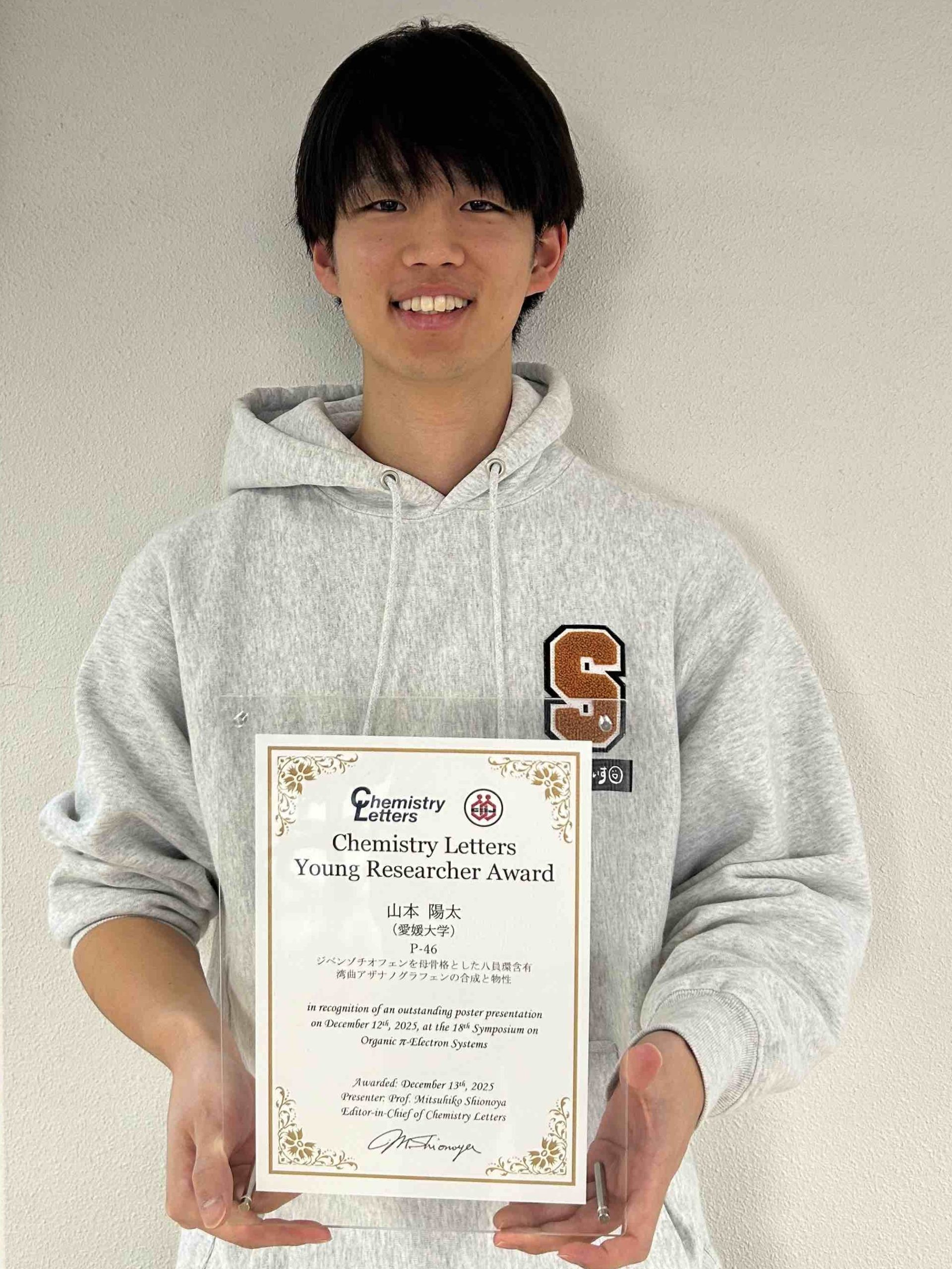 令和7年12月12日(金)~13日(土)に松山市の道後プリンスホテルで開催された「第18回有機π電子系シンポジウム」において理学部化学コース4年生の山本陽太さん(有機化学研究室に所属)が「Chemistry Letters Young Researcher Award」を受賞しました。発表題目は、「ジベンゾチオフェンを母骨格とした八員環含有湾曲アザナノグラフェンの合成と物性」で、大学院理工学研究科の髙瀬雅祥教授らのグループで行われた研究成果です。
