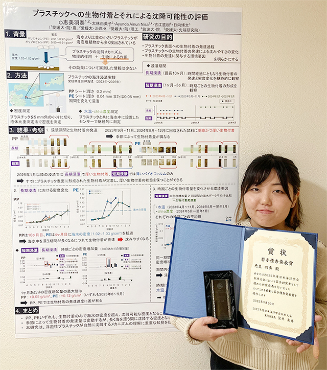 恵美さんの発表題目は「プラスチックへの生物付着とそれによる沈降可能性の評価」で、理工学研究科博士前期課程修了生のAyunda Ainun Nisaさん、沿岸環境科学研究センターの大林由美子 講師、先端研究高度支援室の吉江直樹准教授、理工学研究科の日向博文教授とともに取り組んだ研究の成果です。