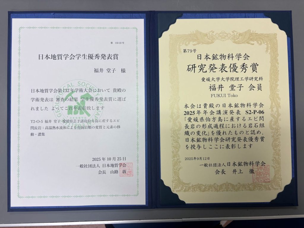 大学院理工学研究科の福井堂子さんが「日本鉱物科学会2025年年会」と「日本地質学会第132年学術大会」において、「研究発表優秀賞」と「学生優秀発表賞」を受賞しました【9月12日(金)・10月25日(土)】