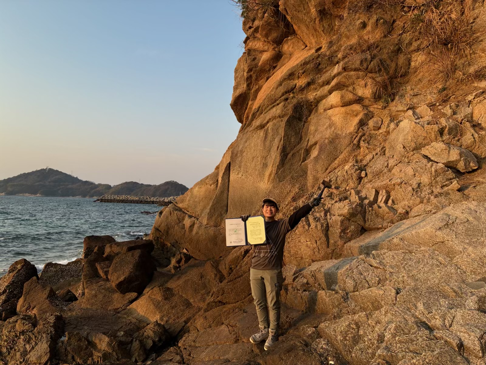 福井さんはこの「エピ閃長岩」について、綿密な野外産状観察を基礎とした、岩石記載、化学組成分析、同位体分析、年代測定など、詳細かつ多岐にわたる岩石学的検討を行い、その形成過程を考察しています。これまでの研究成果のうち、「日本鉱物科学会2025年年会」では岩石組織観察の結果を主とした記載岩石学的特徴について、また「日本地質学会第132年学術大会」では化学組成分析の結果を主とした元素の移動・濃集過程について発表したところ、両者ともに高い評価を得て、それぞれ「研究発表優秀賞」と「学生優秀発表賞」を受賞しました。