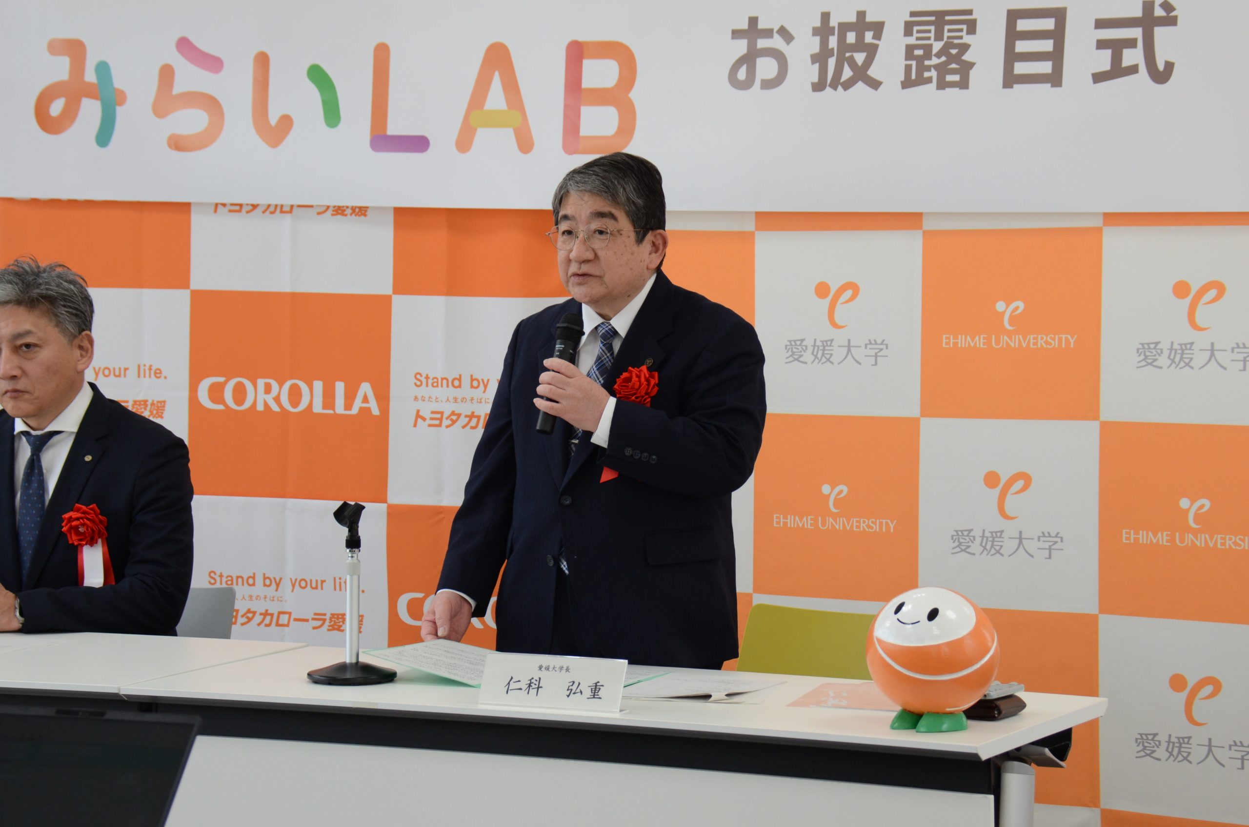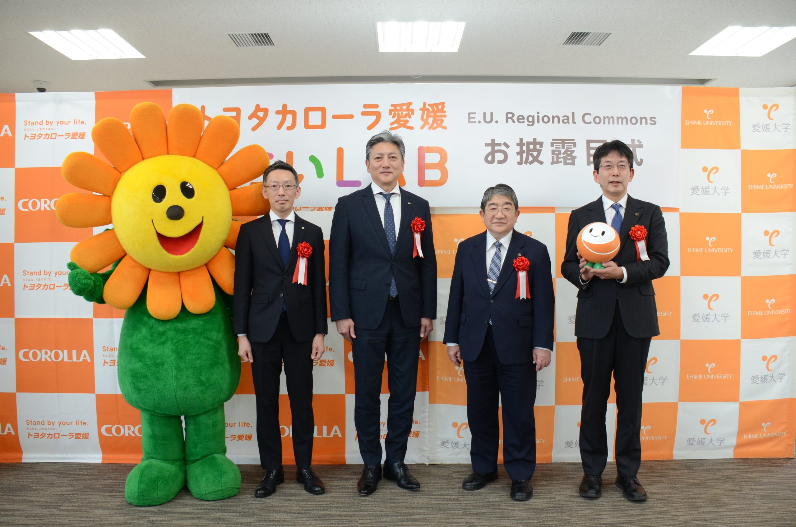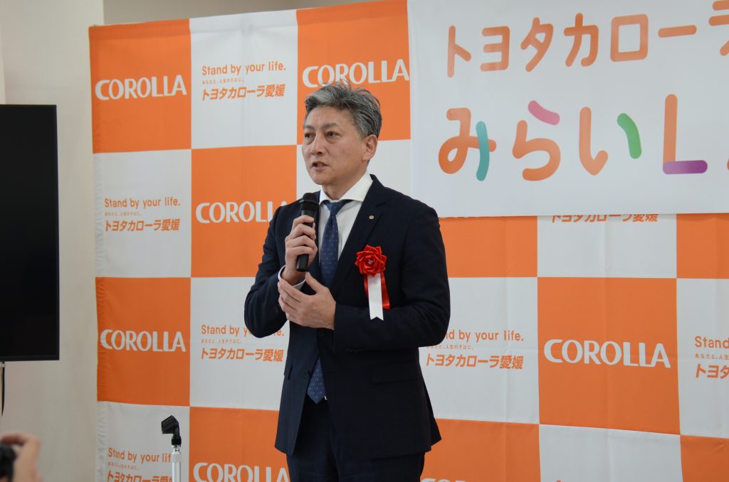 続いて、トヨタカローラ愛媛株式会社の五味徹朗代表取締役専務からトヨタカローラ愛媛みらいLABのサインに込めた思いが語られ、本学の山下政克副学長からは今回導入されるカーシェアについての説明がありました。その後、トヨタカローラ愛媛株式会社のイメージキャラクターの「スマイリン」が応援に駆けつけ、登壇者全員と集合写真を撮影するなど、終始和やかな雰囲気で閉式しました。