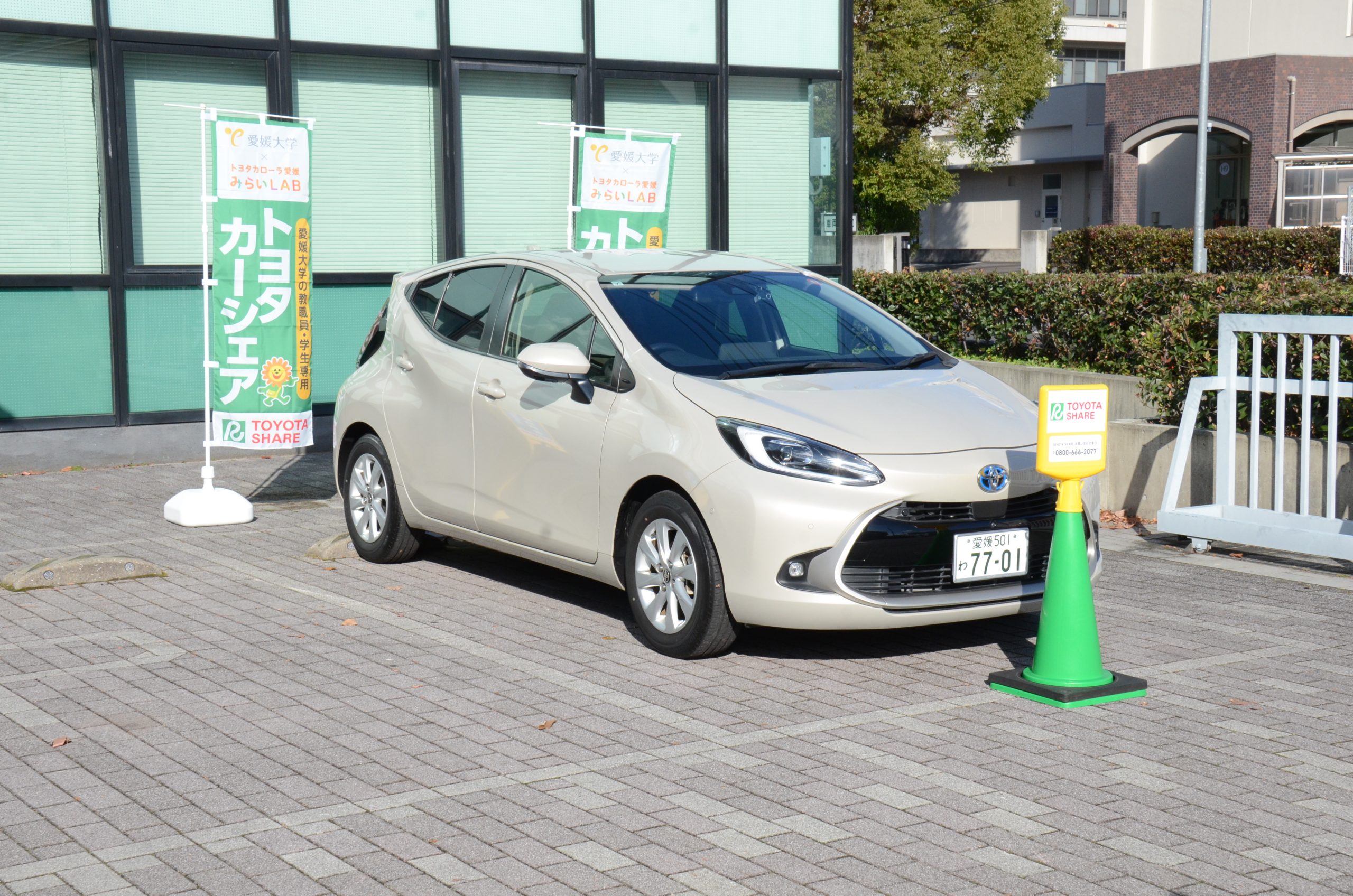 愛媛大学では、教育研究環境を向上するとともに、ステークホルダーとの連携による地域活性化を目的として、本学の保有施設に対するネーミングライツ制度を導入しております。令和7年4月1日からは、城北キャンパスのE.U. Regional Commons1階の「地域交流スクエア」、及び「グリーンホール」のネーミングライツ・パートナーが決定し、それぞれ「NP地域交流ルーム」と「コラボハウスホール」という愛称で活用しています。このたび、新たにE.U. Regional Commons3階の「地域サステナビリティスペース」のネーミングライツ・パートナーがトヨタカローラ愛媛株式会社に決定しましたので、お披露目式を開催しました。また、連携事業の一環として、カーシェアリングサービス(以下、カーシェア)「TOYOTA SHARE」の実証実験を始めることから、あわせてそのデモンストレーションを行いました。