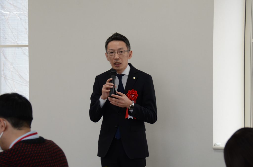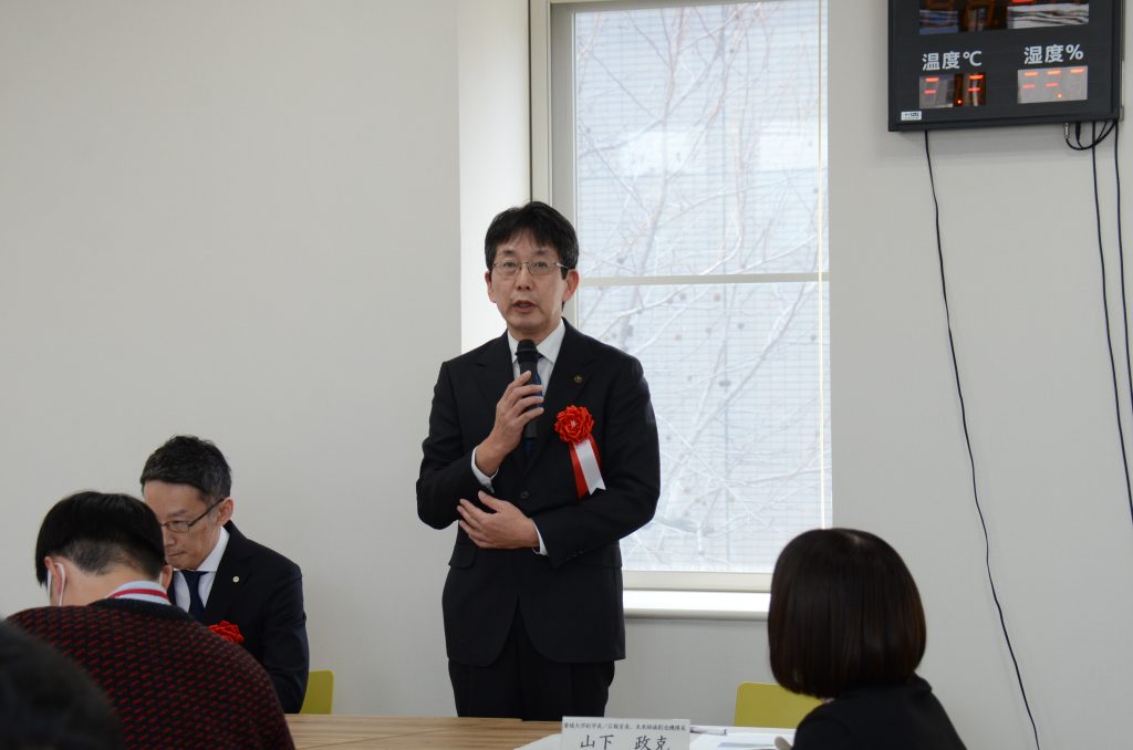 E.U. Regional Commons 3階のトヨタカローラ愛媛みらいLAB(地域サステナビリティスペース)で開催したお披露目式では、はじめに仁科弘重学長から、トヨタカローラ愛媛みらいLABが知恵や知識、技術を共有するコワーキングスペースとして活用されることの期待を込めた挨拶があり、トヨタカローラ愛媛株式会社の松田卓恵代表取締役社長から、トヨタカローラ愛媛みらいLABが開かれた場所として育ち、地域に新たな可能性を広げる場となる願いを込めたご挨拶がありました。