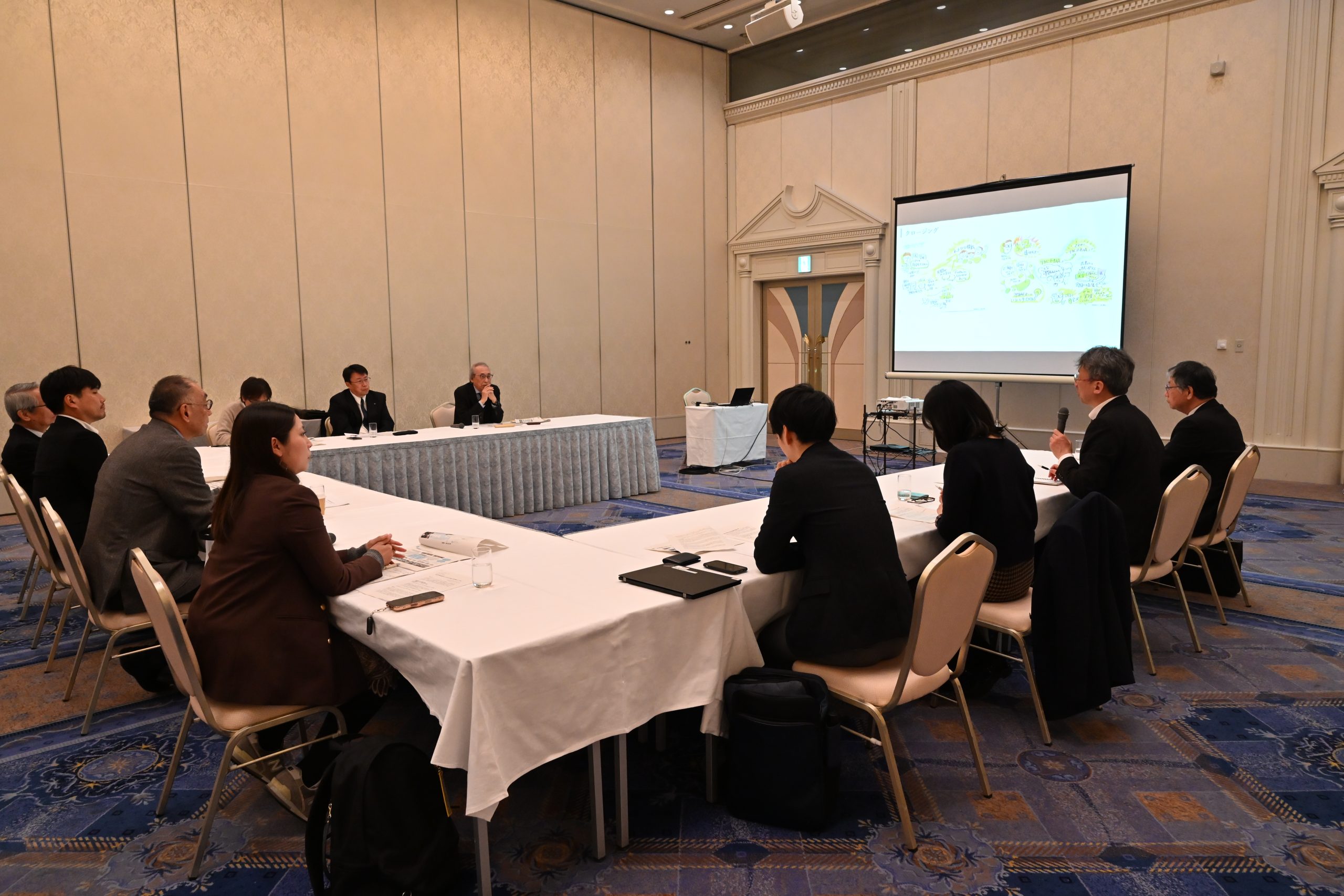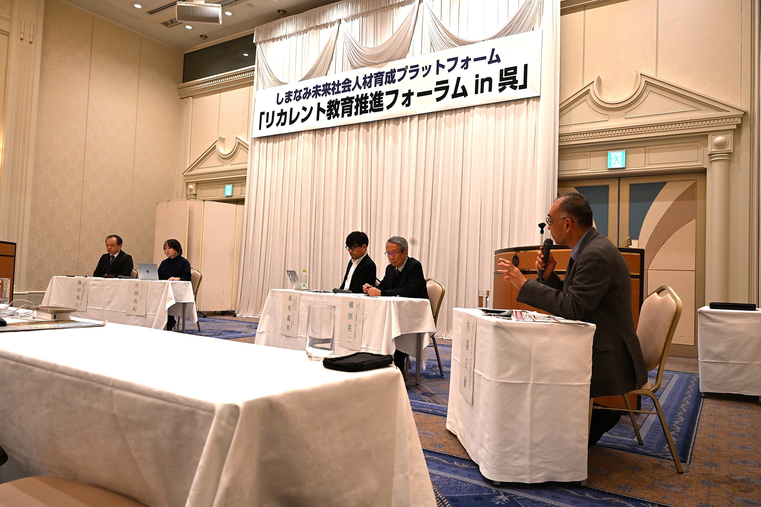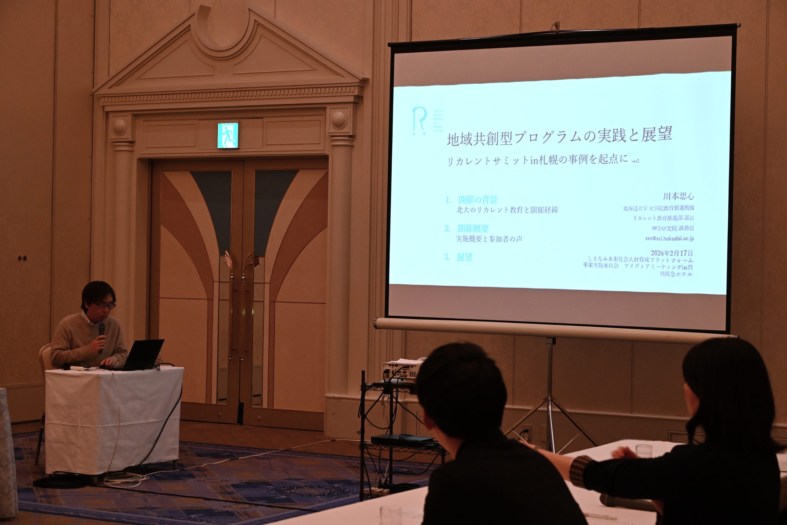「アイデアミーティングin呉」では、板垣会長が司会を務め、北海道大学大学院教育推進機構リカレント教育推進部の川本思心部長から「地域共創型プログラムの実践と展望―リカレントサミットin札幌の事例を起点に―」と題したテーマ提供があり、続いて、新たな地域共創型リカレントプログラムの創出についてディスカッションを行いました。