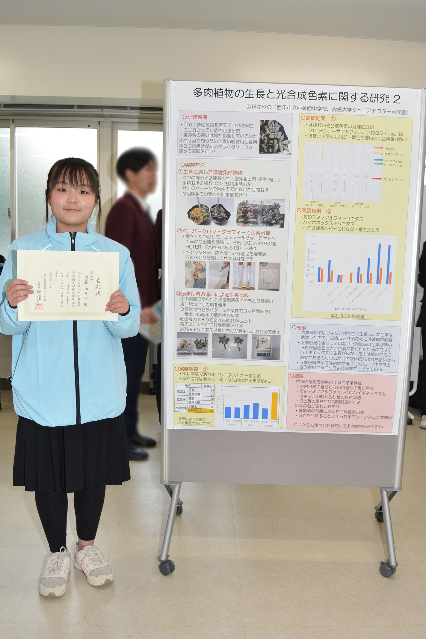 令和8年3月7日(土)に日本生物教育学会四国支部が主催する日本生物教育学会四国支部第9回研究大会が、愛媛大学教育学部で開催されました。同研究大会の「児童・生徒による研究発表の部」において、愛媛大学ジュニアドクター育成塾からは、西条市立西条西中学校2年生の安藤ゆりのさんが「多肉植物の生長と光合成色素に関する研究 2」というタイトルで、新居浜市立中萩中学校3年生の曽我部結理さんが、「心臓の謎を解く!~心臓治療の理解に向けた基礎的研究~」というタイトルでポスター発表を行い、両名ともに奨励賞を受賞しました。