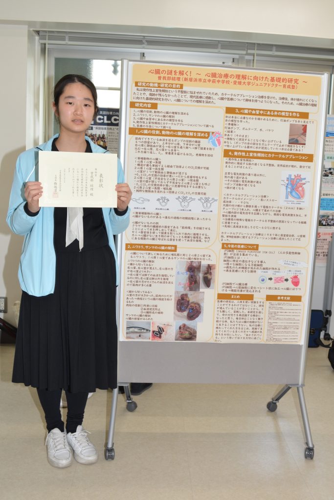 奨励賞の賞状を手に発表ポスターの前に立つ曽我部結理さん