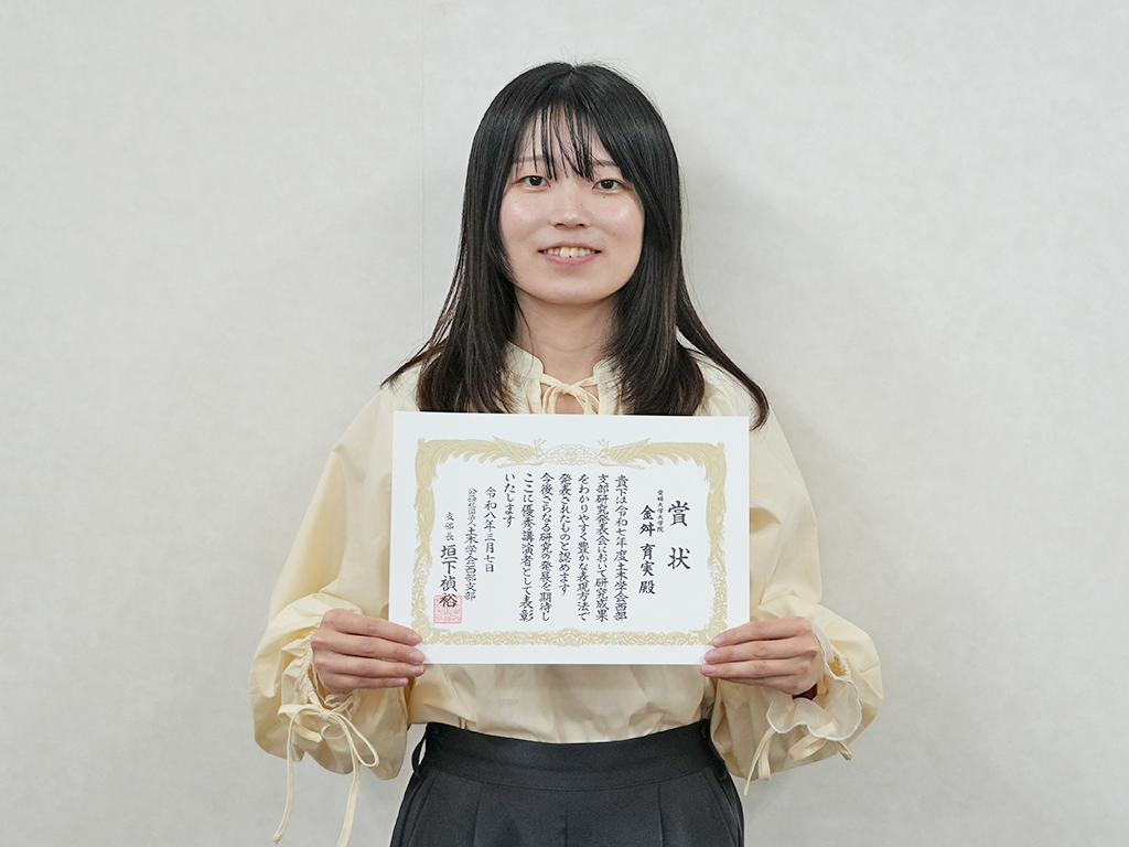 令和8年3月7日に九州産業大学で開催された土木学会西部支部研究発表会において、理工学研究科博士後期課程1年の金舛育実さん(指導教員:先端研究院数理情報部門/GRC兼任 大村訓史准教授)が「優秀講演賞」を受賞しました。