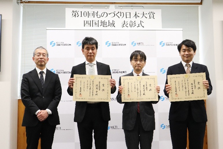 令和8年3⽉23⽇、⼤学院理⼯学研究科の⻩⽊景⼆教授及び岩本幸治教授と、株式会社トーヨ(⻄条市)による共同開発成果「⾼機能強度繊維多層構造体を活⽤して作業性向上を可能とした100MPa級耐圧防護服の開発」が、経済産業省「第10回ものづくり⽇本⼤賞四国産業振興賞」を受賞し、四国経済産業局の吉⽥健⼀郎局⻑より賞状が授与されました。この賞は、第9回から新たに設けられた賞で社会的課題への対応、⾰新性、市場等への波及効果が優れたものに与えられるものです。