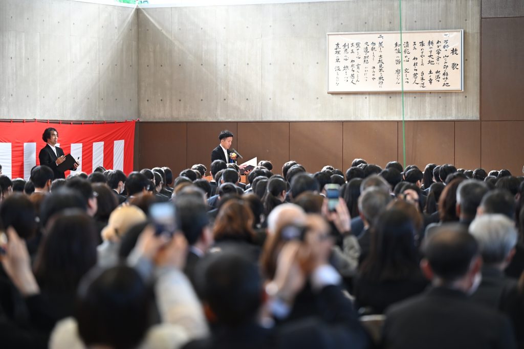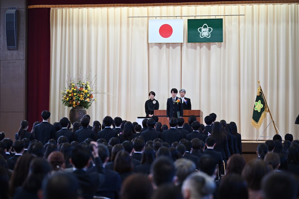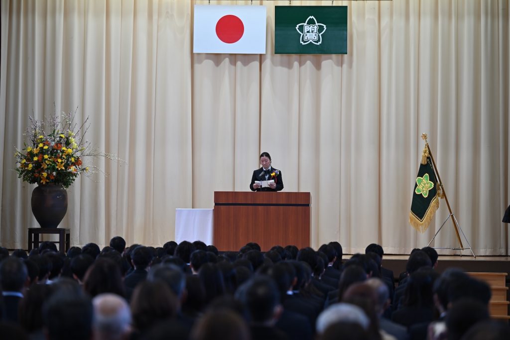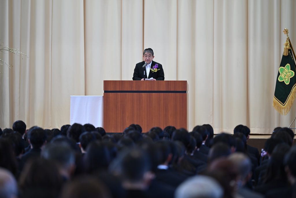 卒業証書の授与や各種表彰の後、吉村直道校長から「みなさんがこれから歩む道のりには、答えの見えない問いや、すぐには成果の出ない努力がたくさんあるでしょうが、どうか焦らず、比べず、今の学びと豊かさを大切にしてください。そして、目に見えない価値を信じる勇気を持ってください。」と式辞がありました。