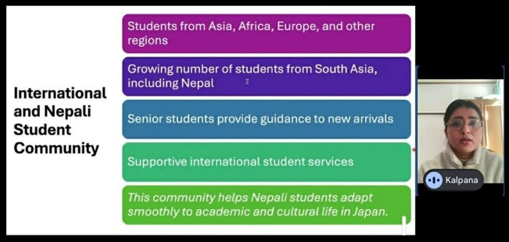 次に、2月19日(木)に理工学研究科博士前期課程2年のパンディット カルパナさんがネパールのトリブバン大学に向けて説明会を行いました。主に理工学研究科について紹介し、参加学生にとって日本への留学を目指すきっかけとなりました。また、本学の国際交流についても説明し、本学への関心を引きました。