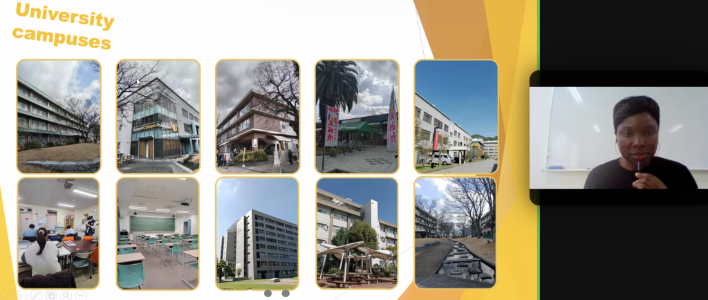 最後に、3月26日(木)には、教育学部研究生のマフォサ テンベリレさんがジンバブエ共和国のヒルサイド・ティーチャーズ大学に向けて説明会を行い、学生7人が参加しました。本学の紹介やアクティビティの紹介だけではなく、松山の家賃など写真を交えて紹介し、とても興味深い内容となりました。紹介後には、学生たちから出願手続きについて質問があり、本学への関心の高さがうかがえました。