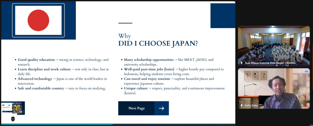 まずは、1月21日(水)に農学研究科修士課程1年のラフライ ザカ ルローラさんがインドネシア共和国にあるカマル州立高等学校の学生54人に向けて説明会を行いました。本学のキャンパスや学部紹介に加え、日本留学を決めたきっかけについて説明し、参加者は熱心に耳を傾けていました。説明会の最後には、松山での暮らし等について、参加者から積極的に多くの質問が寄せられました。1月30日(金)にはインドネシアのスラバヤ工科大学に向けて説明会を行い、学生88人が参加しました。奨学金制度や授業の特色について詳しく説明し、有意義な交流となりました。