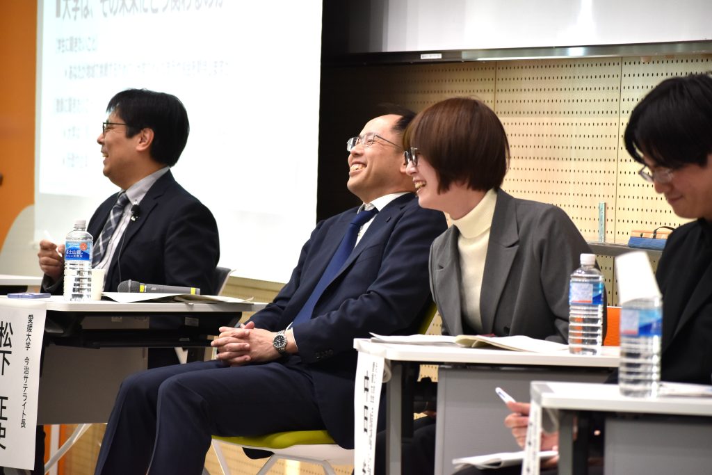 トークセッションでは、「人材が産業を支え、産業が圏域を形づくる―地域未来戦略における地方大学の役割と可能性―」をテーマに、愛媛大学今治サテライトの松下正史サテライト長(理工学研究科教授)、愛媛大学未来価値創造機構の井口梓副機構長(社会共創学部教授)、えひめ学生起業塾7期生の中田歩実さん(農学部3年生)、6期生の平井完樹さん(社会共創学部2年生)が登壇しました。「これから、どこで、どのような挑戦をしたいか」、「地域は、その挑戦を支えられるか」、「大学は、その未来にどう関わるのか」という問いを軸に、具体的な実践や経験を交えた議論が行われました。