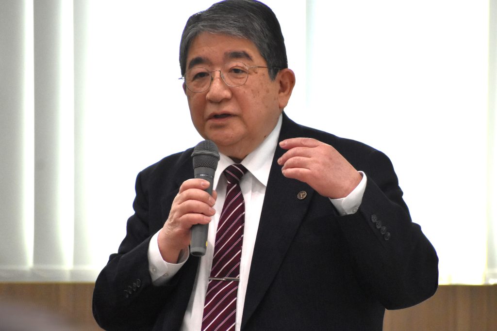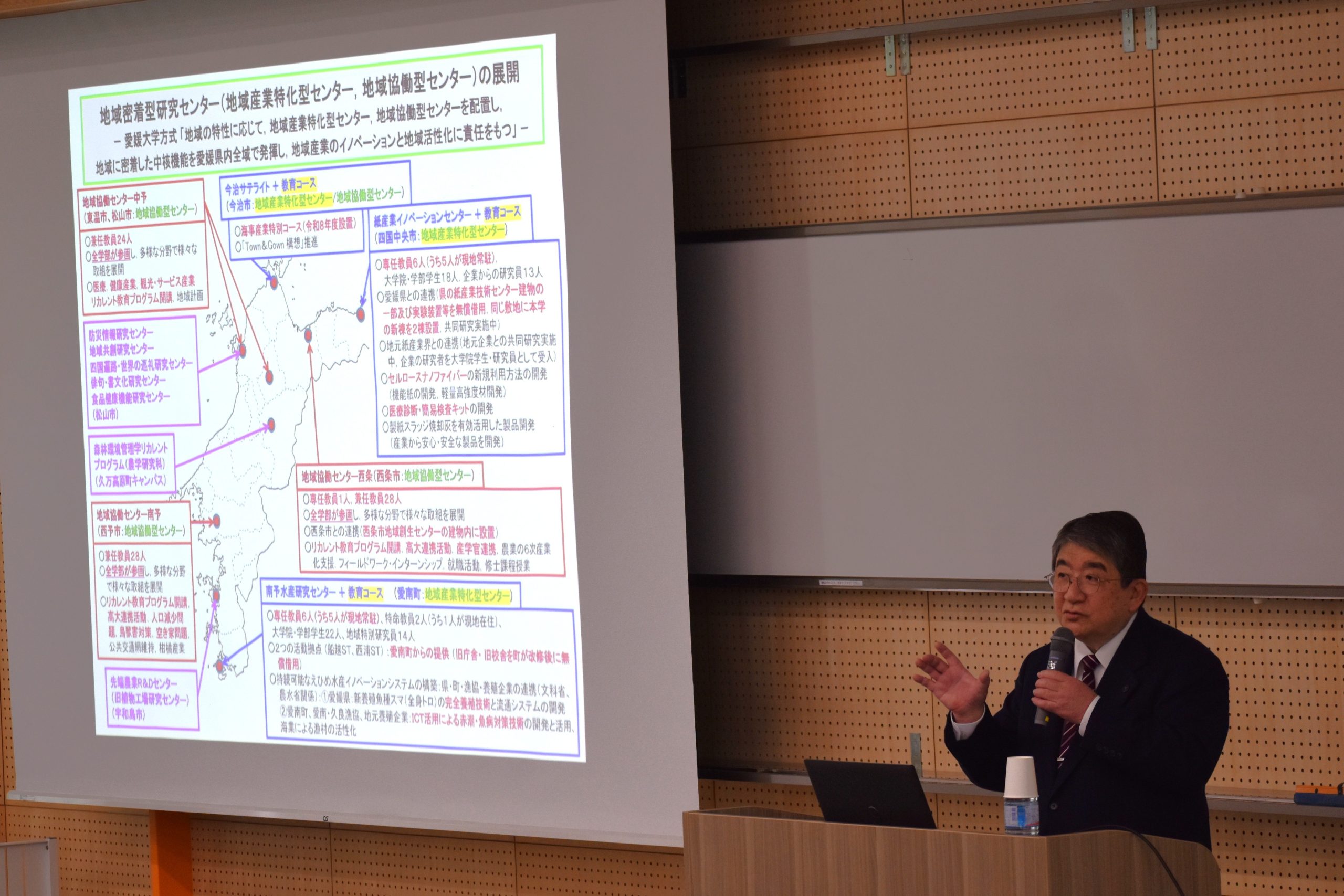 始めに、仁科弘重愛媛大学長から開会挨拶があり、人口減少や産業構造の変化が進む中で、大学には地域社会を先導する人材育成と地域産業の振興がこれまで以上に求められていることに触れました。その上で、愛媛大学は、大学の研究シーズを起点とするだけでなく、地域産業や地域が抱える課題やニーズに向き合い、教育・研究・地域連携を進めてきたことについて言及しました。また、学生教育に加え、社会人の学び直し(リカレント教育)も含め、大学が「全世代対応型の『地域における知の拠点』」として地域とともに未来を考え、実践していく重要性を強調しました。