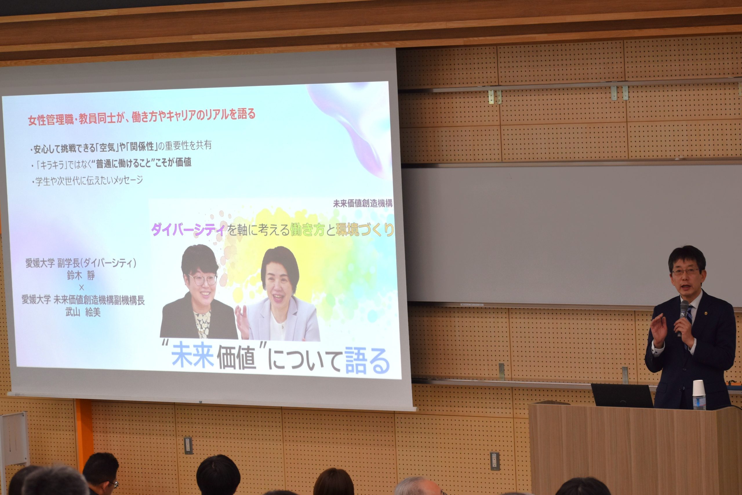 その後、愛媛大学未来価値創造機構の山下政克機構長から、「地域の未来を切り拓く“知と創造の対話”」と題して、同機構の取組紹介がありました。未来価値創造機構は、10~15年後の中期的未来を見据え、新たな価値を社会に先行して議論・発信することを目的とし、シンポジウムの開催や対談企画「未来価値を語る」などを通じて、立場や分野を越えた対話の場づくりに取り組んでいることについて紹介しました。