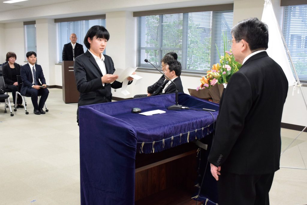 これを受けて、新入生を代表し、愛媛大学配属の山中美里佳さんが「農学は、持続可能な社会の構築を根幹から支える学問です。私たちは専門分野こそ異なりますが、それぞれが高い志を持ち、これらの課題の解決に資する研究に真摯に取り組んでまいります。」と宣誓しました。