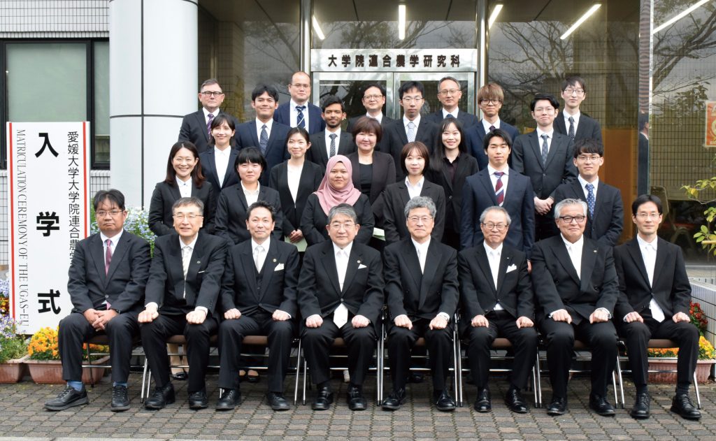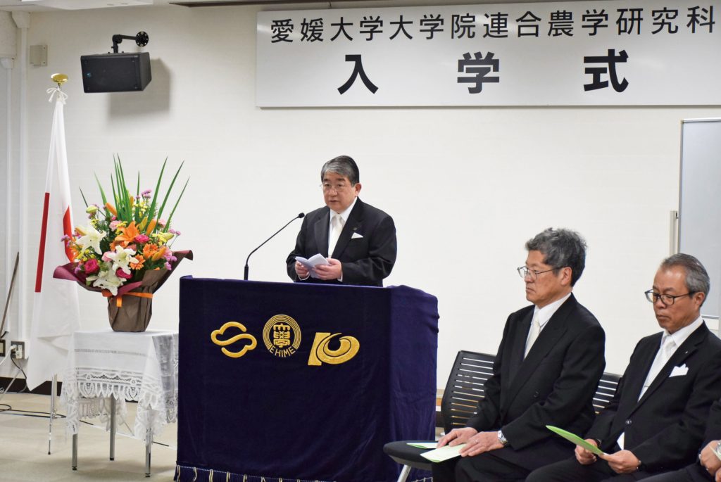 式典では、仁科弘重愛媛大学長から、「連合農学研究科を構成する3大学は、世界各地の大学、研究機関との学術交流や、それぞれが立地する地域との連携を活発に行っています。皆さんには、この知的ネットワークを最大限に活用して、社会との多様な繋がりを広げ、専門人材としての見識を深めて下さい。」と、新入生へメッセージが贈られました。